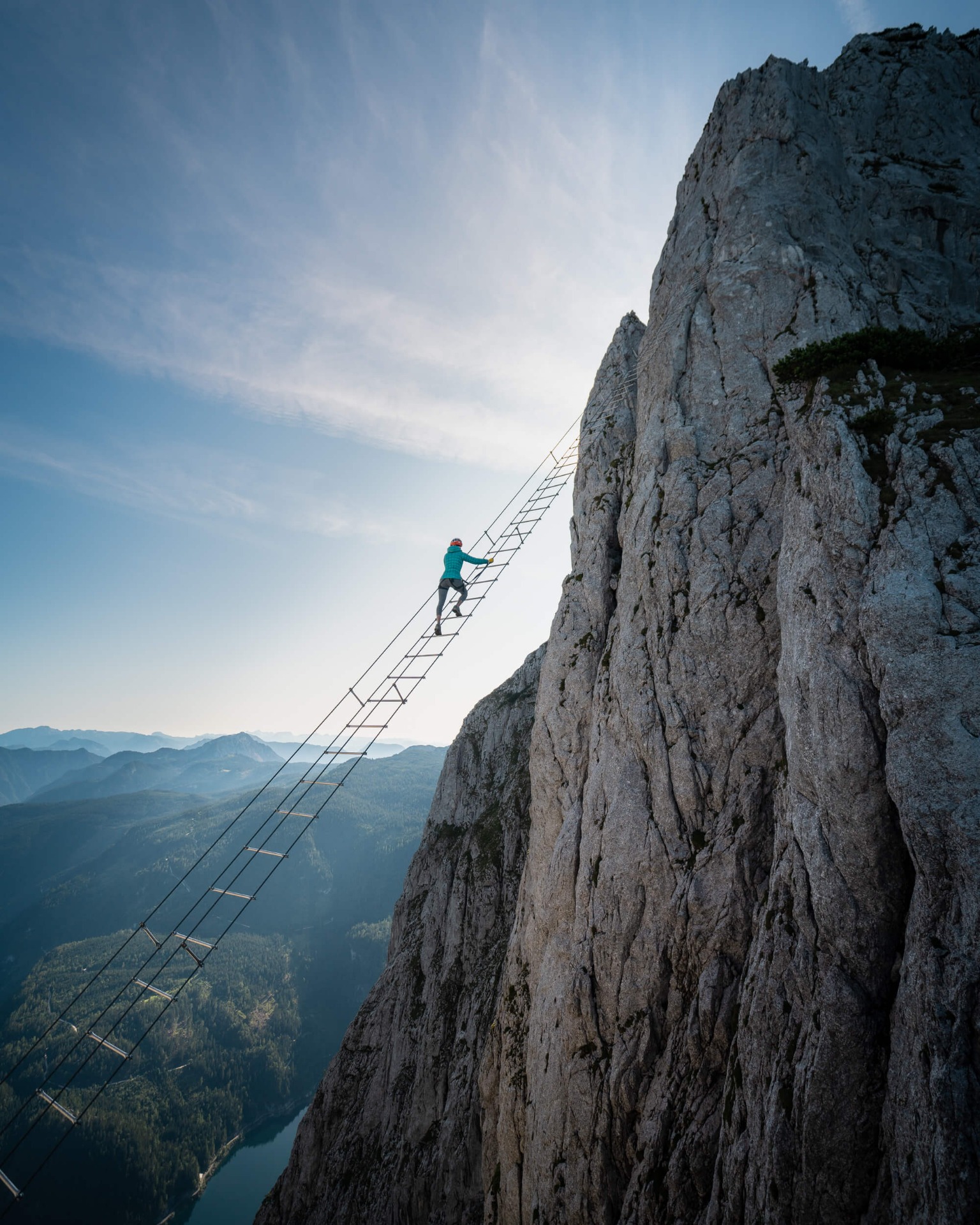 - Dechberoucí zážitek na visutém žebříku nad propastí spojeném s Ferratovým výstupem na Donnerkogel.